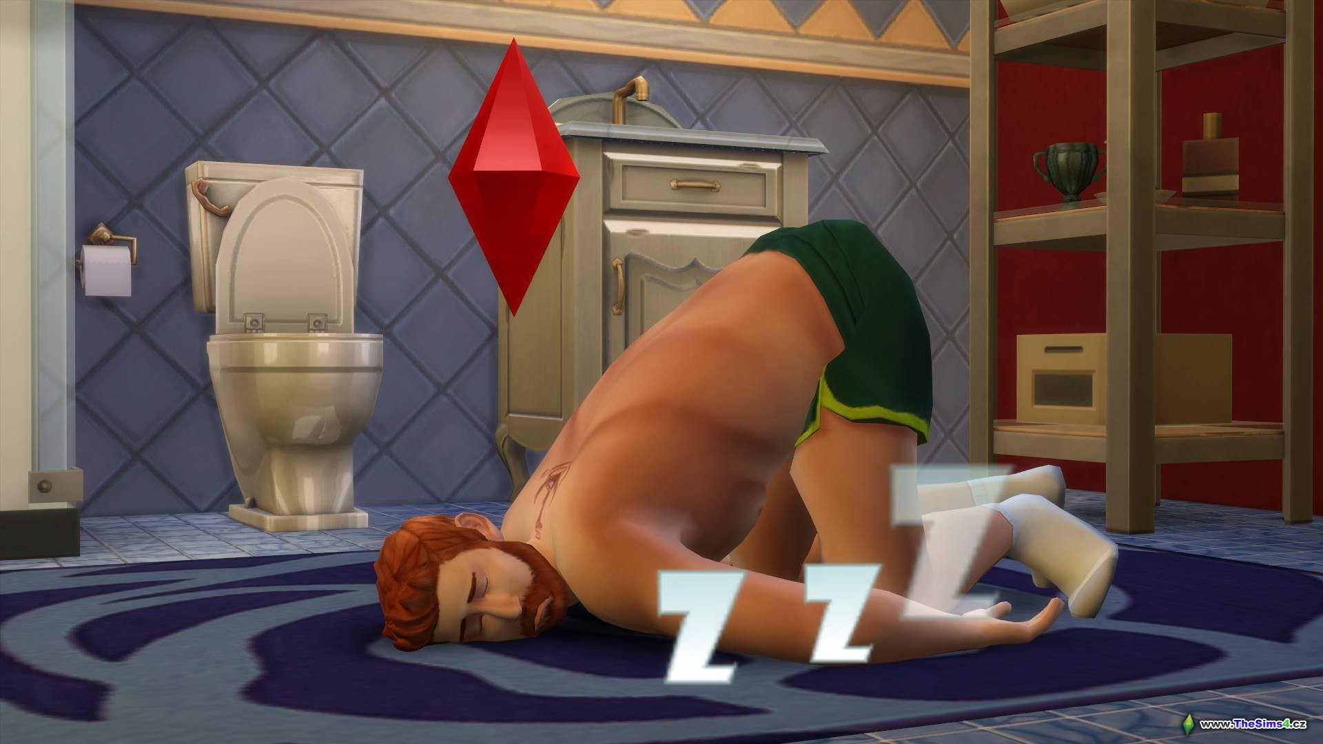 Interiér koupelny. Jo a spící Simík.